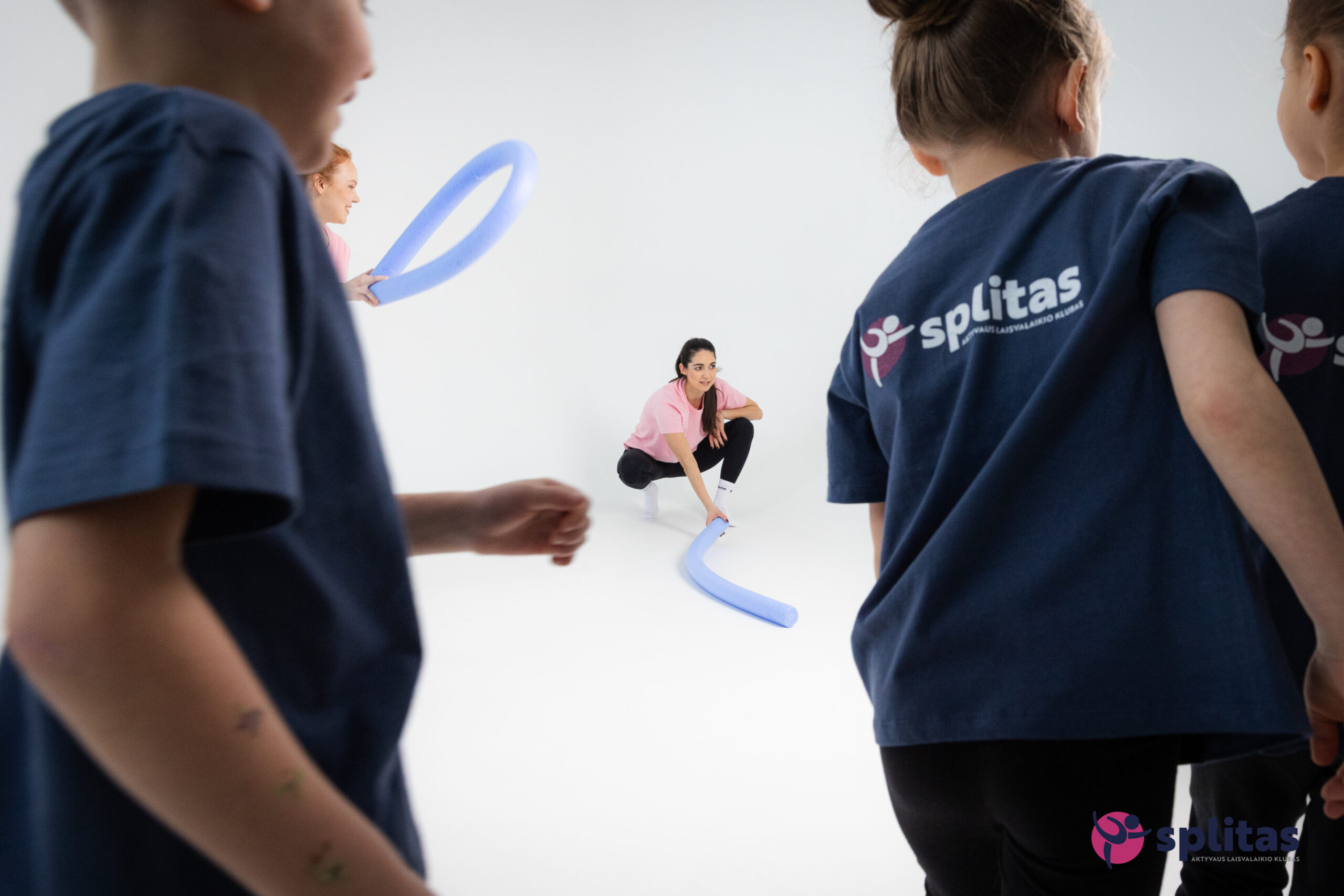 Iš tarp vaikų išlenda mergaitė, laiko dantį ir burną.
